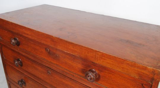 A 19th century Victorian oak straight bank chest of drawers consisting of 5 long straight drawers raised on bracket feet with carved knob handles.