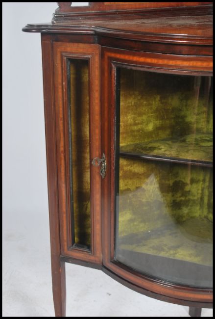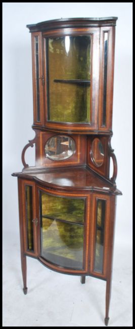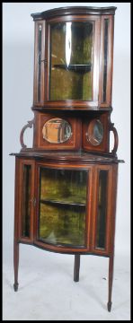 An Edwardian mahogany inlaid upright corner display cabinet having glass cabinet over gallery with cupboard beneath. All raised on tapering inlaid supports