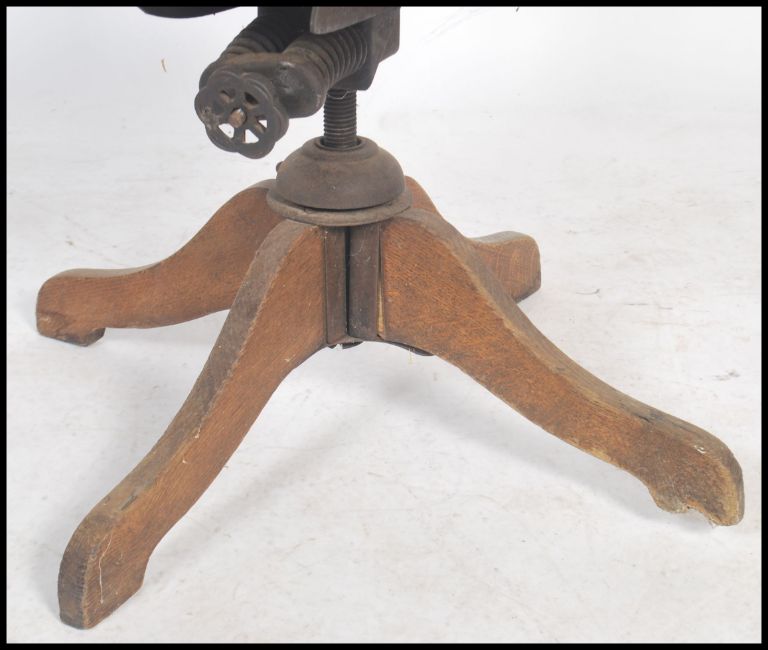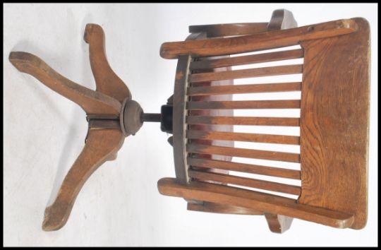 A 1930's Industrial oak office swivel chair being raised on a quadruped base with swivel column. The seat with pad centre and spindle gallery back rest