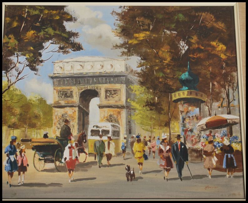 A large mid 20th century oil on canvas painting of a Parisian street scene with the Arc de Triomphe to the background, signed to the corner Housier. Together with a smaller unsigned continental oil on canvas painting picture.