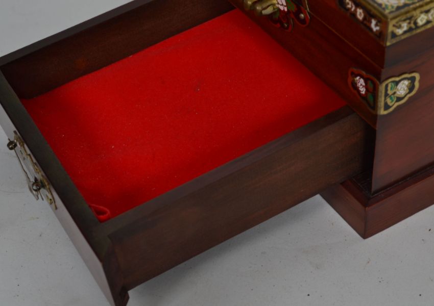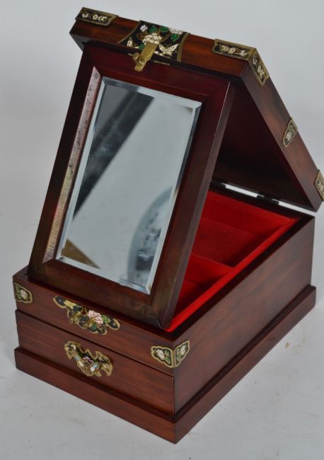 A 20th century ladies vanity mirror and box with folding mirror and opening drawer with brass and enamel decorated panels.
