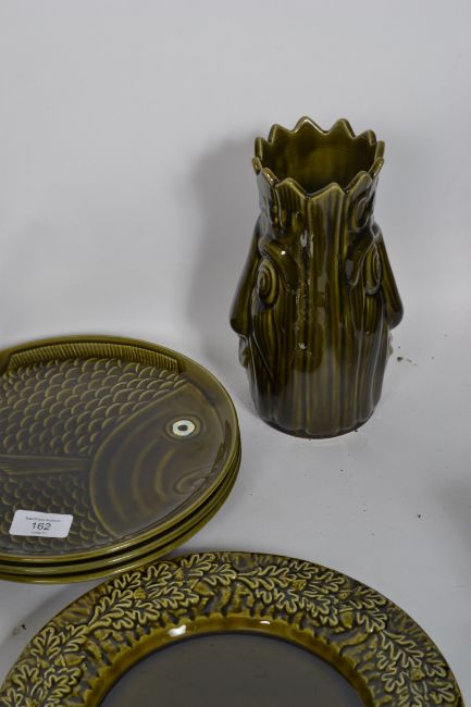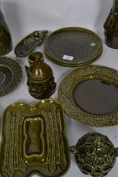 A collection of vintage retro ceramics by various makers, all with a green glaze to include a cucumber  relish dish with lid,