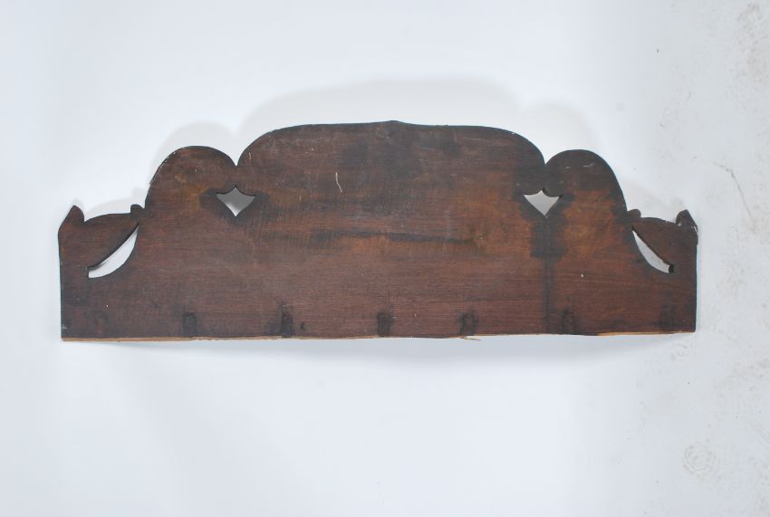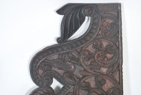 A 19th century Chinese carved hardwood gallery back. Crisply carved with scenes of vine and Deity's having winged edges