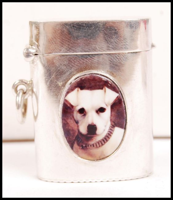A silver barrel vesta case with an enamel pictorial lozenge with scene of a dog to the front. Hinged top above, strike to base. Total weight 22.5g / Size 4cms tall