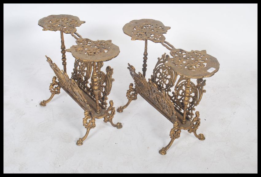 A pair of cast mid century Italian ornate ormolu side table magazine racks / plant stands side tables of rococo form. Each with multiple pierced works to the sides and platform tiers.