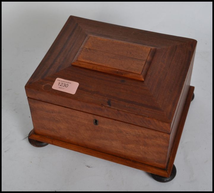 A 19th century Regency satinwood ladies workbox of sarcophagus form. Of exquisite satin wood panel construction with hinged top above.
