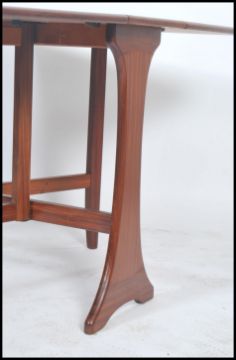 A 1970's teak wood Danish influenced G-Plan drop leaf dining table raised on shaped supports with full length drop leaves having gate leg supports. 137cms x 91cms