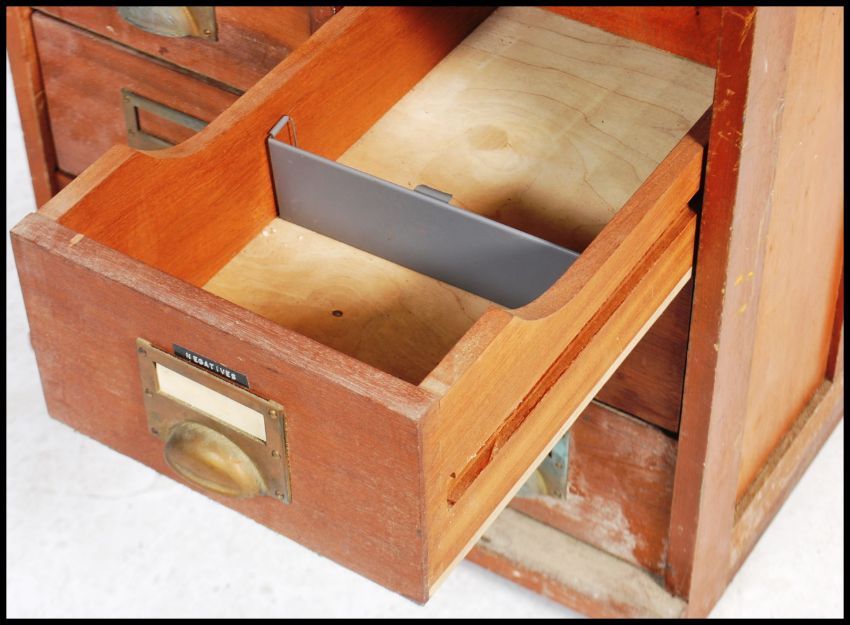 A vintage 130's / 40's oak industrial drawers, set within a block of eight having brass cup handles and name spacers. Raised on a plinth base. Measures 74cms high by 62cms square.