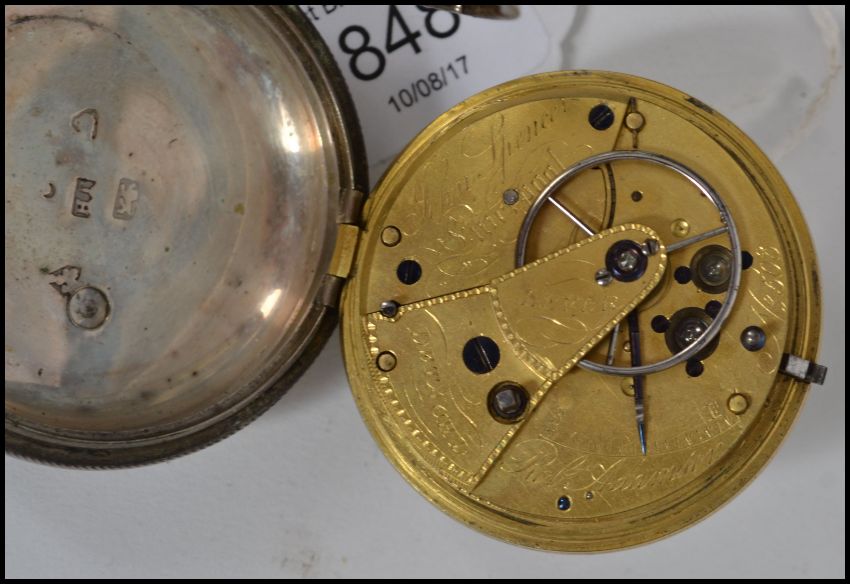 A silver hallmarked cased fusee key wind pocket watch with enamel dial having Roman numeral batons with a seconds subsidiary dial. makers name to the verso for  John Spencer, the case bearing London assay marks.