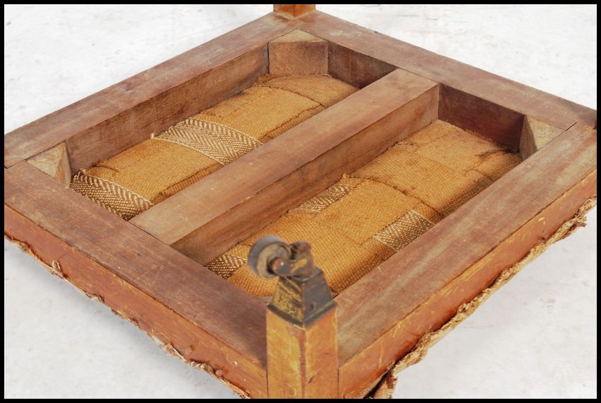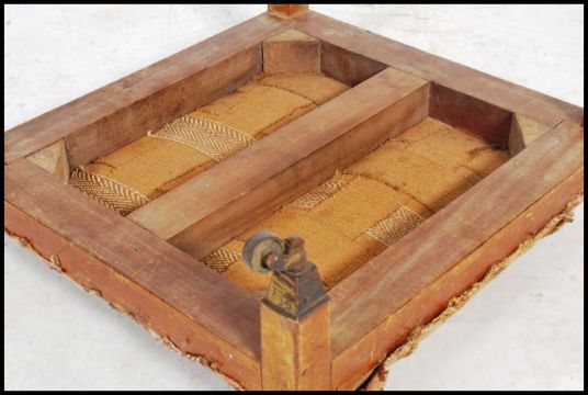 An Edwardian mahogany footstool of square form being raised on mahogany squared legs with brass cup castors. Above an overstuffed upholstered top