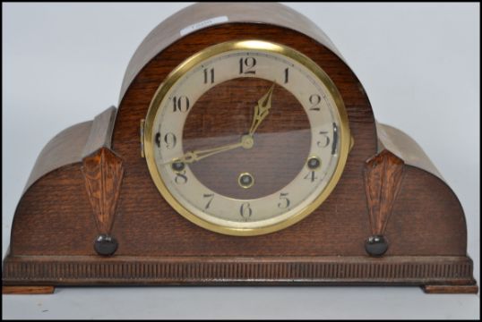 A 1930's Art Deco napoleon hat clock mechanical mantel clock having a numerical face and 3 train movement.
