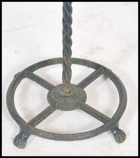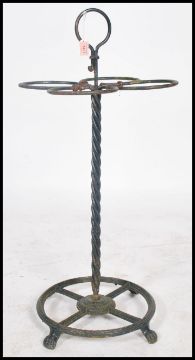 A unusual early 20th century vintage metal stick / umbrella stand having a central twist column with four hooped sections and a handle atop being ebonised.