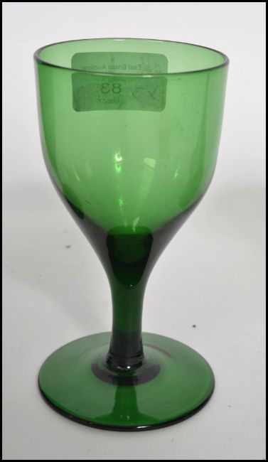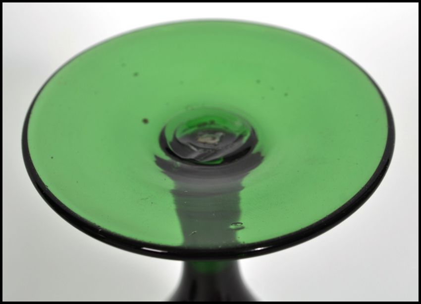 A trio of three 18th century Georgian Bristol green glass wine glasses each one raised on a plain foot with tapering stem with ogee bowl with broken pontil mark to base.