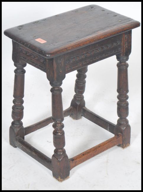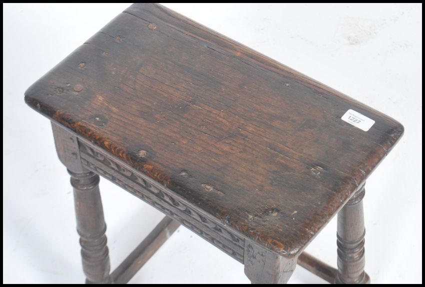 A believed 18th / 19th century country oak peg jointed stool raised on gun barrel turned legs united by square peripheral legs having fitted frieze with flared shaped top seat