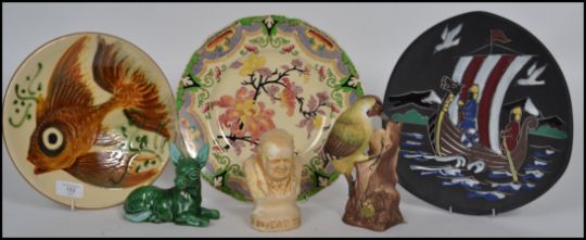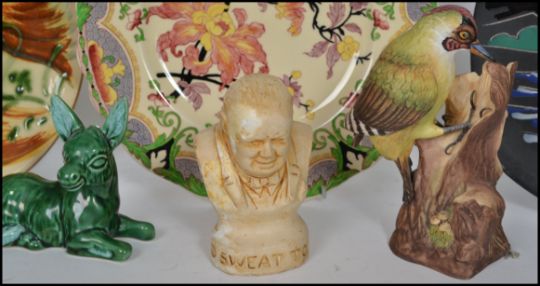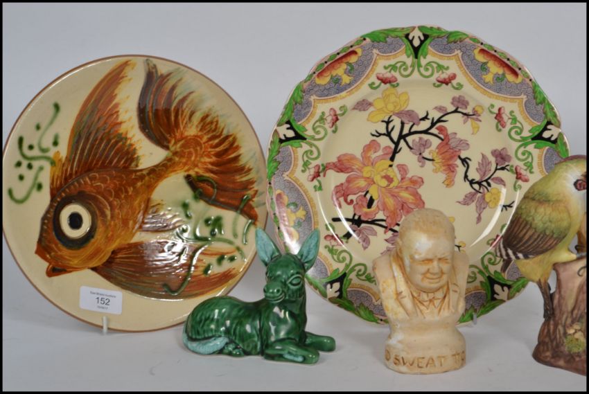 A collection of ceramics to include an early 20th century cabinet plate by Royal Doulton, A Norwegian studio pottery plate, a studio pottery plate of a fish, ceramic Green Woodpecker, possible SylvaC Donkey in a rare colourway and a Winston Churchill.