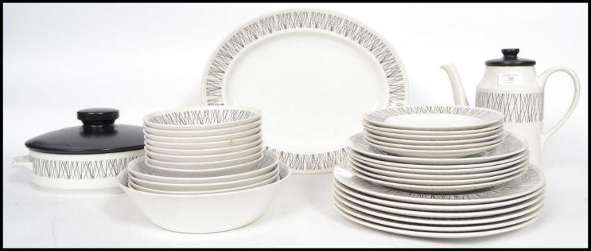 A collection of vintage mid century Midwinter Graphic black and white ceramics to include tureen, plates, bowls, cups, serving tray etc.