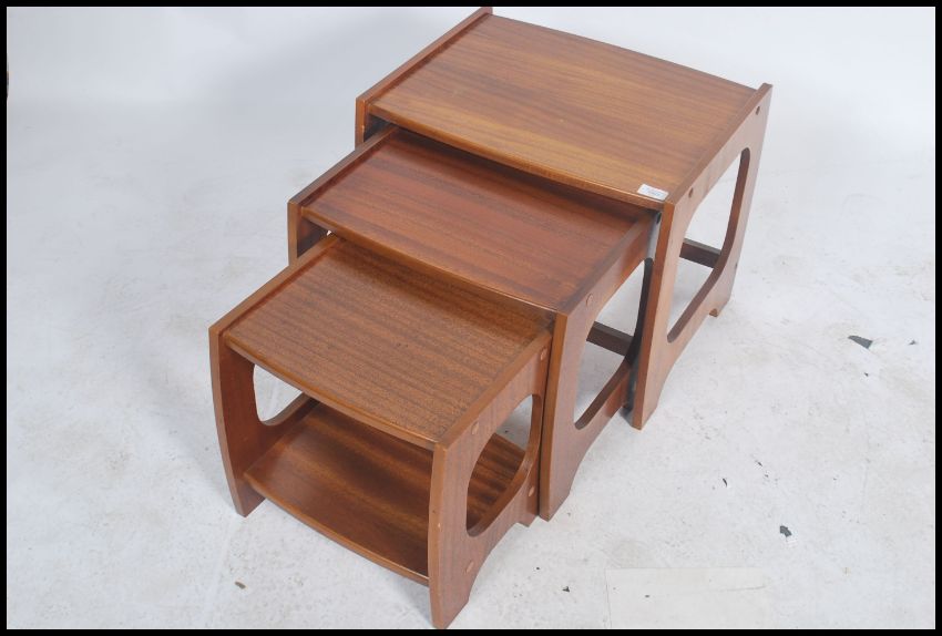 A retro teak wood 1970's graduating nest of tables in the the manner of G Plan. The tables having angular legs united by reverse stretchers with graduating table tops above.