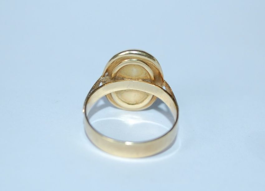 A hallmarked 14ct gold ring set with an oval cut tigers eye cabochon. Size M. Weight 3.7g.