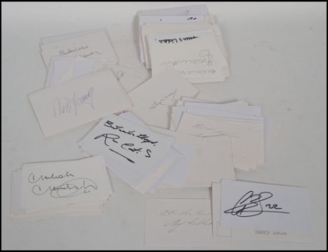 Autographs; a large and extensive collection of Premiership Football players' autographs. Each signed to a plain white card, most undedicated. All hand signed, and obtained personally in recent years. To include; Gareth Bale, Yakubu, Phil Parkes, Alan Mulnery, Bobby Collins, Mike Summerbee, Eddie Gray, Stuart Pearson, Brian Talbot, Gordon Cowans, Frank Casper, Wyn Davis, Clive Allen, Terry Dyson, and many others. 300+ signatures.