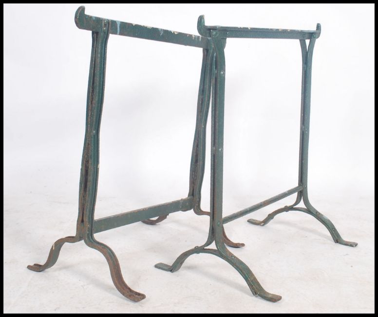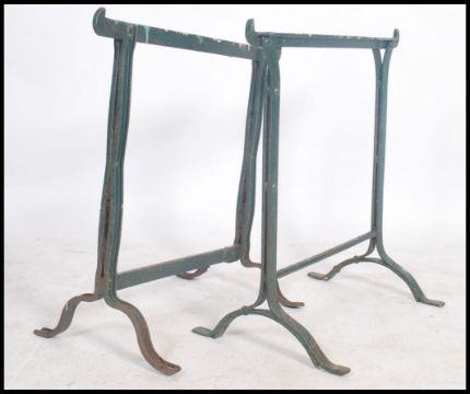 A pair of green painted workmen's trestle stands, not being a matched pair.
