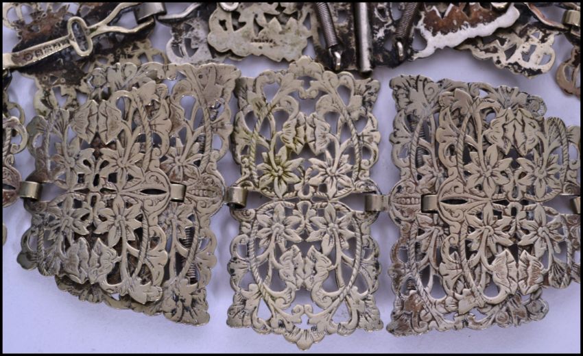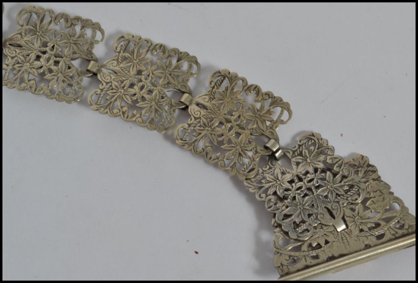 A 20th century silver plated nurses belt having a pierced rococo design with adjustable spring each piece stamped EPNS.