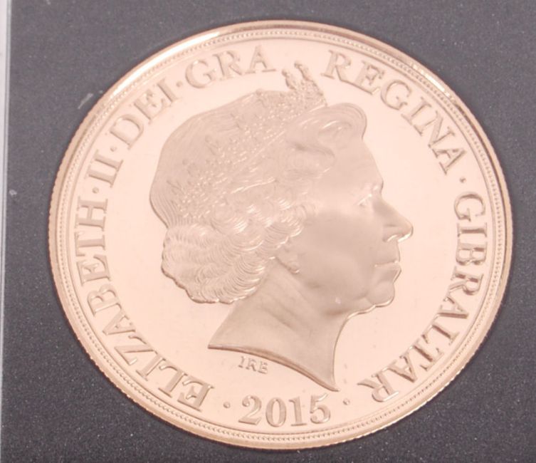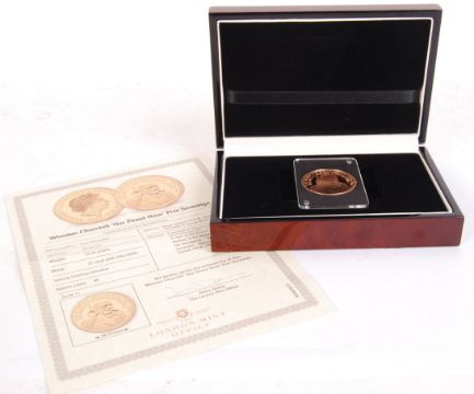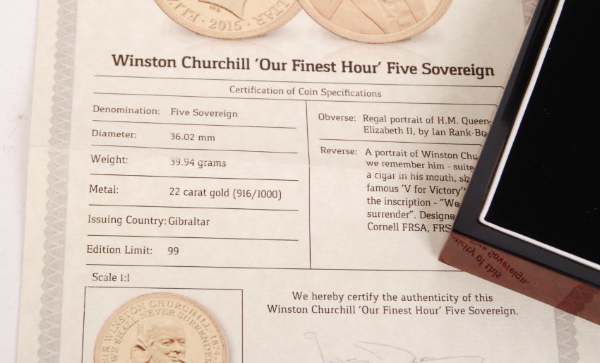 A London Mint Office issued Winston Churchill ' Our Finest Hour ' Five Sovereign. 22ct gold. Within the presentation case, with certificate and slipcase presentation box. 39.94g.