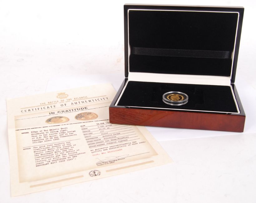 A London Mint Office issued ' Battle Of The Atlantic ' 24ct gold Quarter Crown sovereign proof coin. Gibraltar. Limited edition to 499. Within presentation box, with certificate. 7.78g.