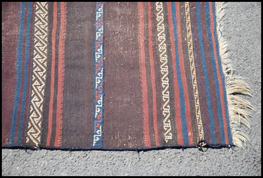 A large Afghan / Persian Balouch Kilim runner rug having dark central ground with central spiral medallions having tassled edges. Measures 335cms x 80cms