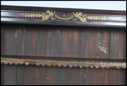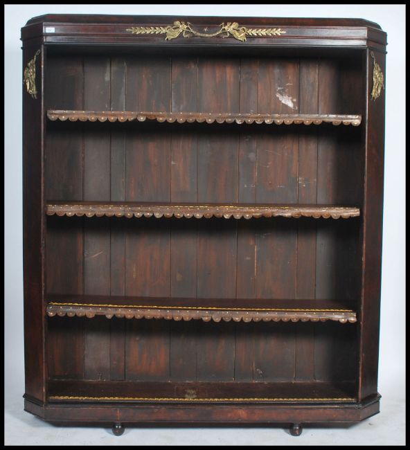 A large 19th century walnut library bookcase having adjustable leather arcade covered shelves with ormolu decorations of angels with horns. Finished with a shaped cornice, the entire bookcase with canted corners. Measures  190cms x 170cms x 34cms