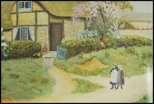 E Blundell; A 20th century oil on board framed and glazed naive painting depicting cottages and trees with girls walking being set to a good gilt frame. Signed by artist to corner