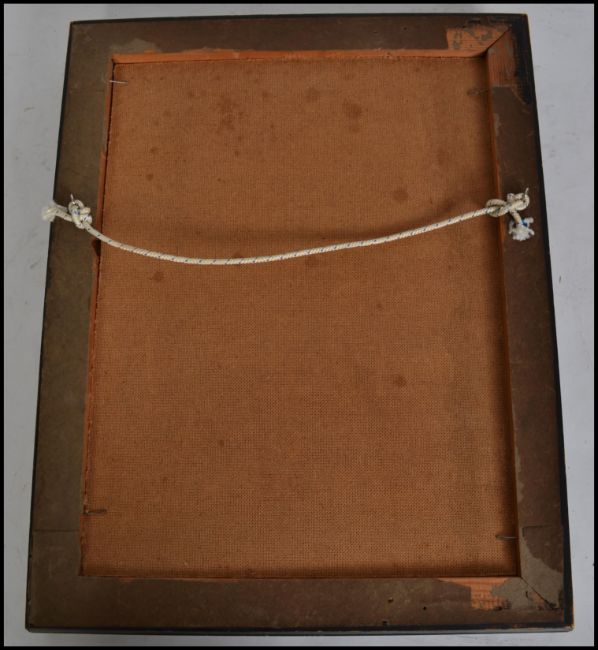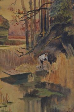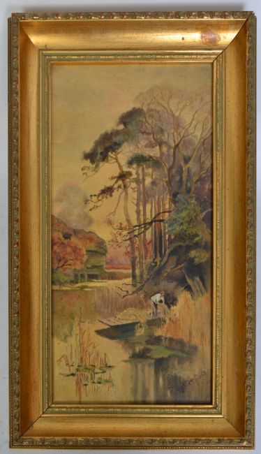 A vintage 20th century oil on canvas painting of a river scene depicting a man collecting reeds set in a good gilt fram. Signed by artist R Matter Face? to lower corner.