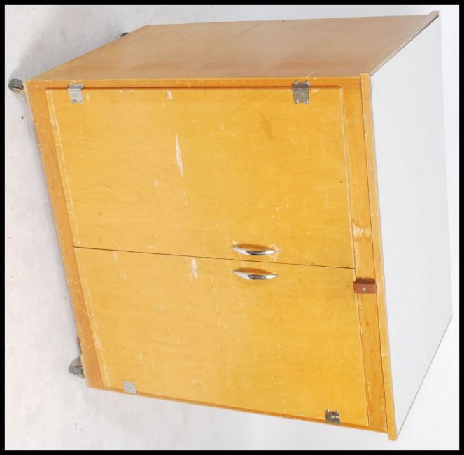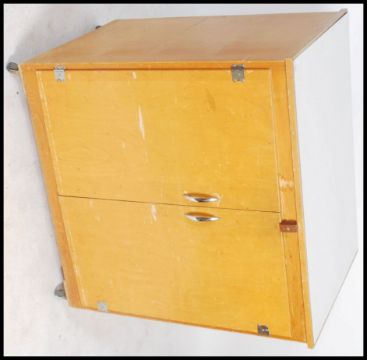 A mid century / 1970's retro beech wood school cupboard having formica top over cupboards with inset shelving and all raised on castors to the base. Measures 98cms by 94cms by 65cms.