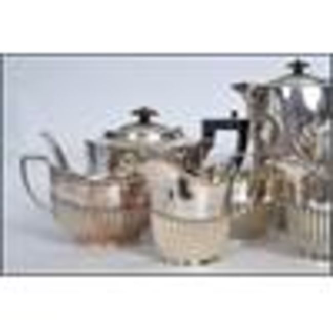 An early 20th century silver plate 4 piece tea and coffee service by Levesley Brothers comprising teapot, coffee pot, sugar bowl and creamer. Together with another teapot similar and twin handled sugar bowl Measures 28cms wide.