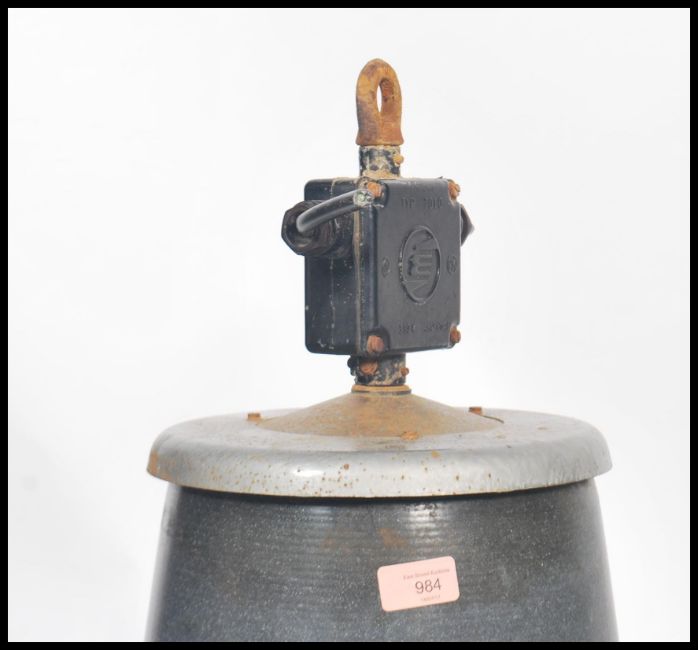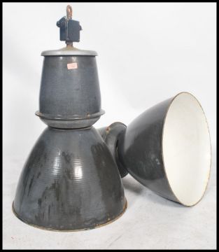 A pair of large vintage industrial 20th century factory black enamel ceiling lights. Each  retaining the original fixture points with large black half moon pendant shades. Matching further pairs in lot 1043