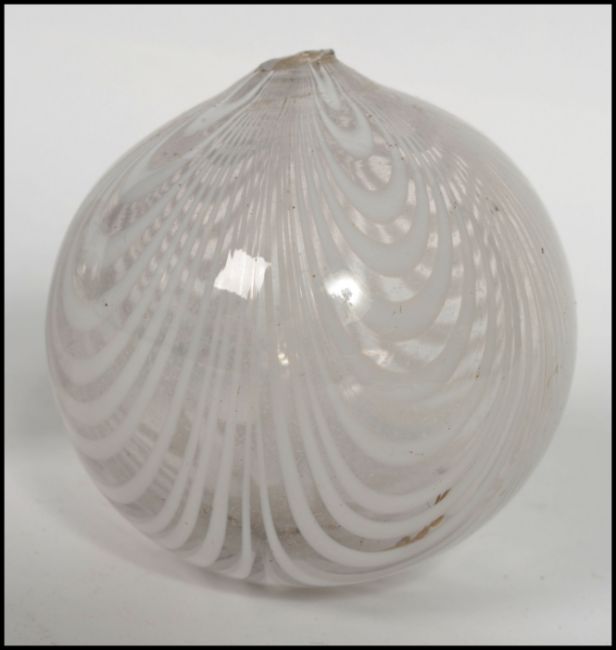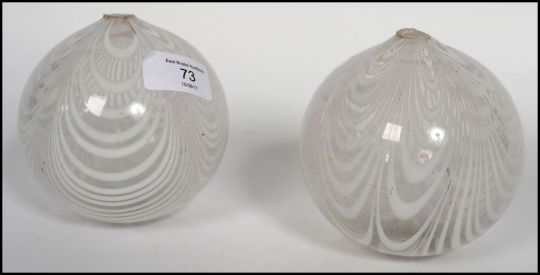 A pair of early 19th century Nailsea glass witch balls having a banded white design.