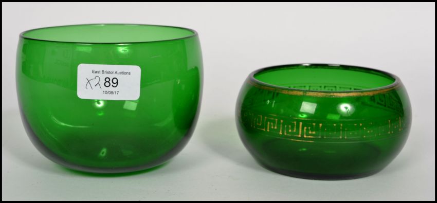 Two Georgian Bristol green glass finger bowls one being a plain green example and the other being a Regency example with gilt Greek key decoration.