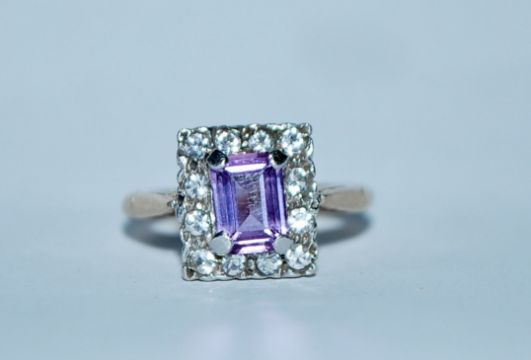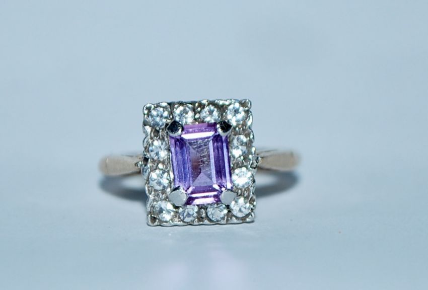 A hallmarked 9ct gold purple sapphire and white stone cluster ring. Hallmarked Birmingham. Size K. Weight 3.8g.