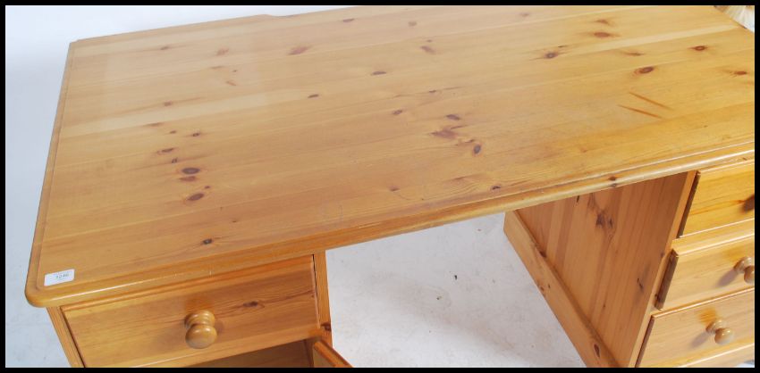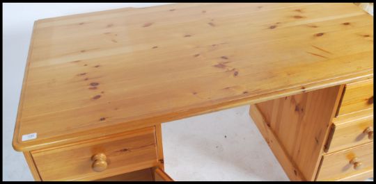A 20th century contemporary twin pedestal pine knee hole desk having an arrangement of drawers raised on a plinth base.