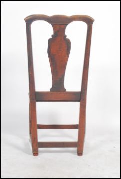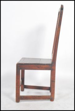 An 18th century north country oak dining chair having a panel seat with square legs united by peripheral stretcher with shaped back rest to the rear