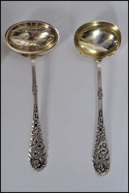 A collection of Danish Silver Plated serving spoons and ladels each with  with intricate rococo designs to handle all being stamped with the two tower plate mark and the mark of Bishop Absalon. To include tea strainer, salad server, chocolate ladel, serving spoons etc and a cake slice. Longest 27.5cms