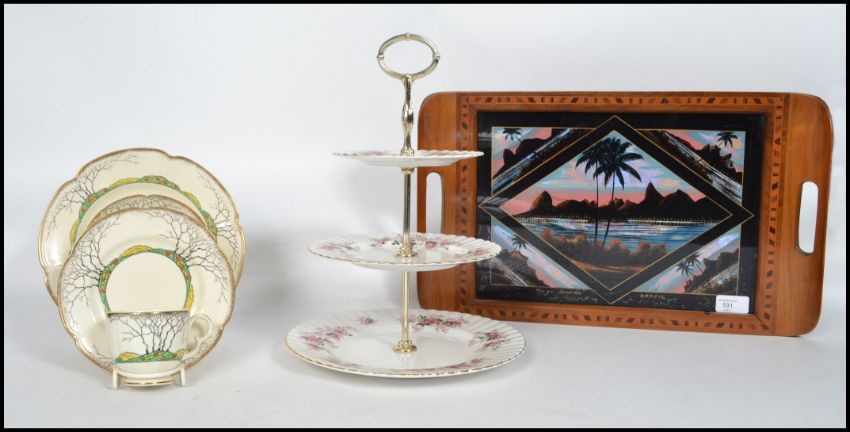 A vintage 20th century Art Deco Crown Devon Bone China ' Glenwood Trio ' together with a Rio De Janerio inlaid tray decorated with a central panel constructed from butterfly wings and a Royal Albert Lavender cake stand.