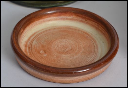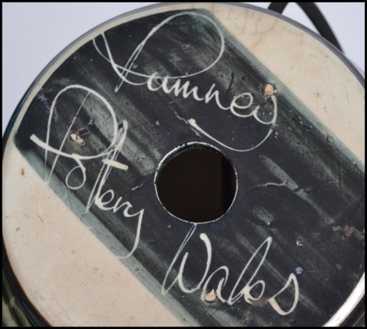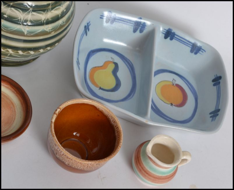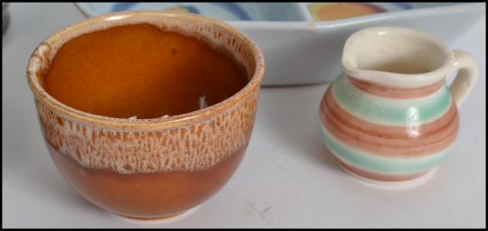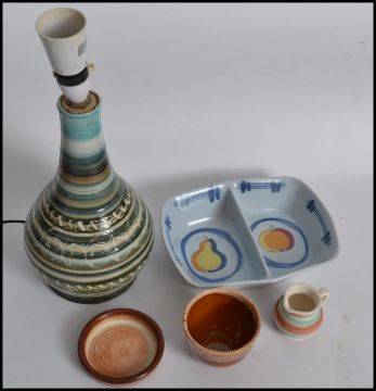 A good group of vintage 20th century studio art pottery to include a Rumney of Wales pottery lamp base decorated with bands of earthen hues, a Pitochry ash tray / pin dish and a bowl of similar form along with a signed pottery jug. Measures: 37cm high.