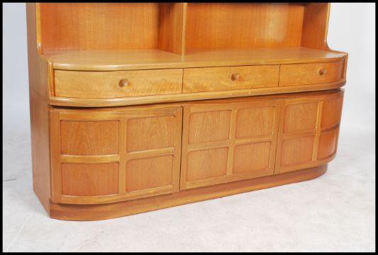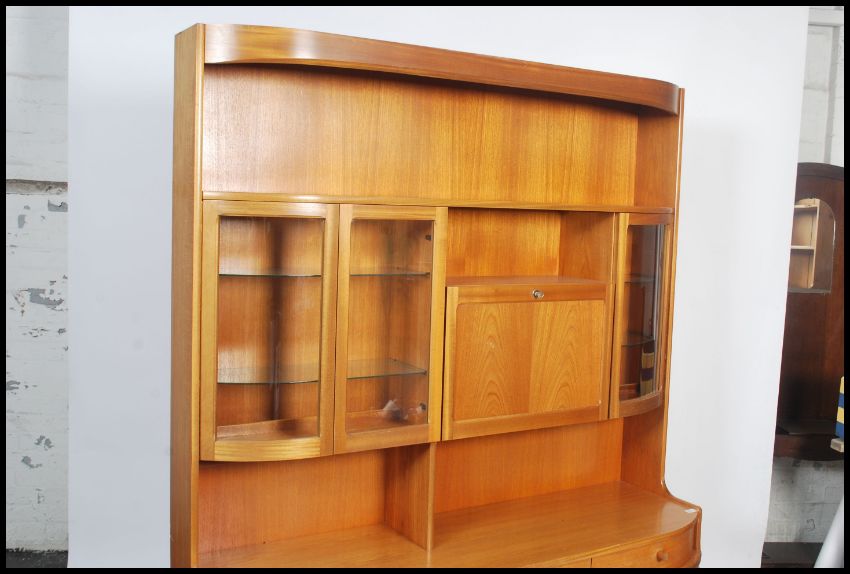 A 1970's G-Plan style teak wood sideboard comprising a base with drawers and cupboards having an upright back with smoked glass door cabinet and further shelving. Dismantles into 2 pieces for ease of movement. Measures 197cms high by 153cms wide.