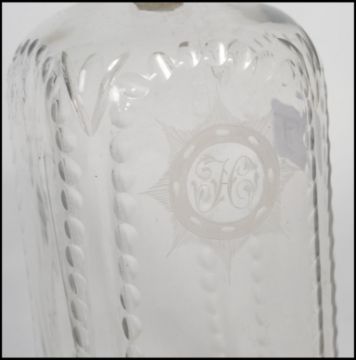 A 18th century Georgian spirit decanter having an etched armorial shield crest with monogram to centre, faceted body and a faceted pear drop stopper and a grounded pontil mark to base.