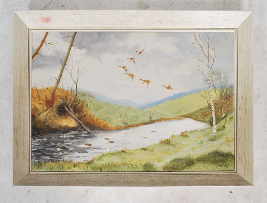 Sw Nelson 1964. A mid century oil on canvas of wildfowl over river being signed to the corner and in the manner of Vernon Ward. Set within a white frame