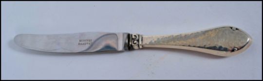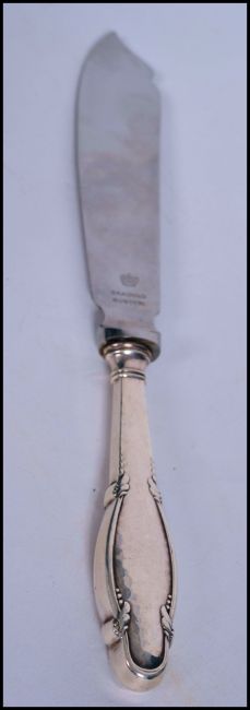 A Danish silver handled fish knive knife and another, both with fabulous shaped handle being marked Johannes Siggaard having triple towers mark and date for 1946.  The blades marked for Rustfri Raadvad. Longest measures 22.5cms long / total weight 91.9g
