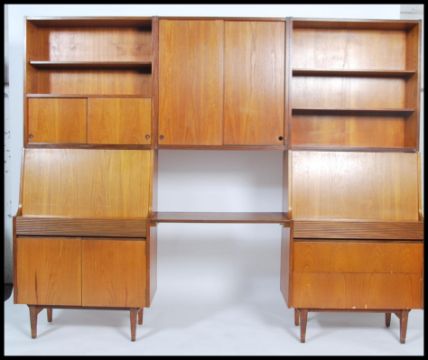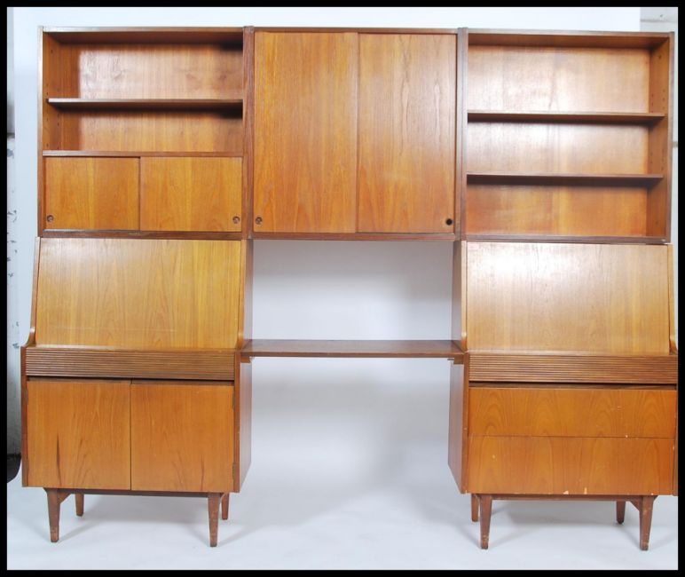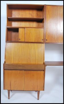 A stunning 1960's teak wood modular wall system in the manner of Robert Heritage for Archie Shine. The system with twin bureau's comprising a series of cabinet, cupboards and shelves. Believed to be retailed by Waring & Gillows