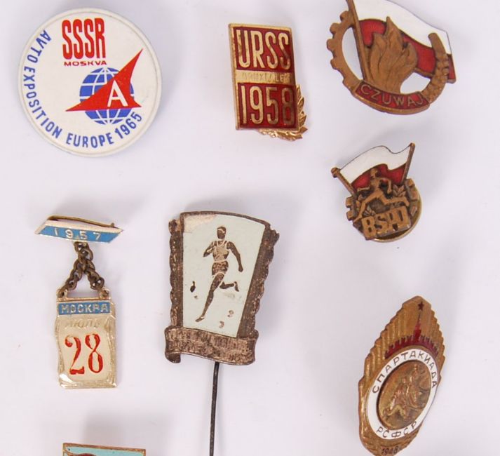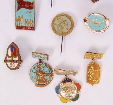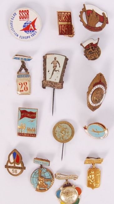 A collection of 14x enamel & metal sporting & various events 20th century USSR Soviet Union & communist states badges to include; 1965 Eastern Europe Excorted Tours, 1958 Brussels hosted Soviet exhibition, diving, Czechoslovakian 1958 sports event, Polish Scouts, running, football, 'Mockra 1957', 1948 hockey etc. All with their pins.