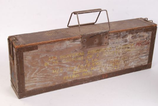 Two vintage military related wooden ammunition / carry cases. The first being a RASC 1945 dated wooden case, the other likely a WWI First World War optical instrument case, with unusual locking handle mechanism. Largest being; 62cm long.