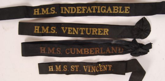 A collection of original assorted vintage cuff titles / title bands for sailor's hats. Comprising of: HMS Nelson, HMS Birmingham, HMS Neptune, HMS Defiance, HMS Excellent, HMS Indefatigable, HMS Venturer, HMS Cumberland and HMS St Vincent. All black, with gold thread lettering.